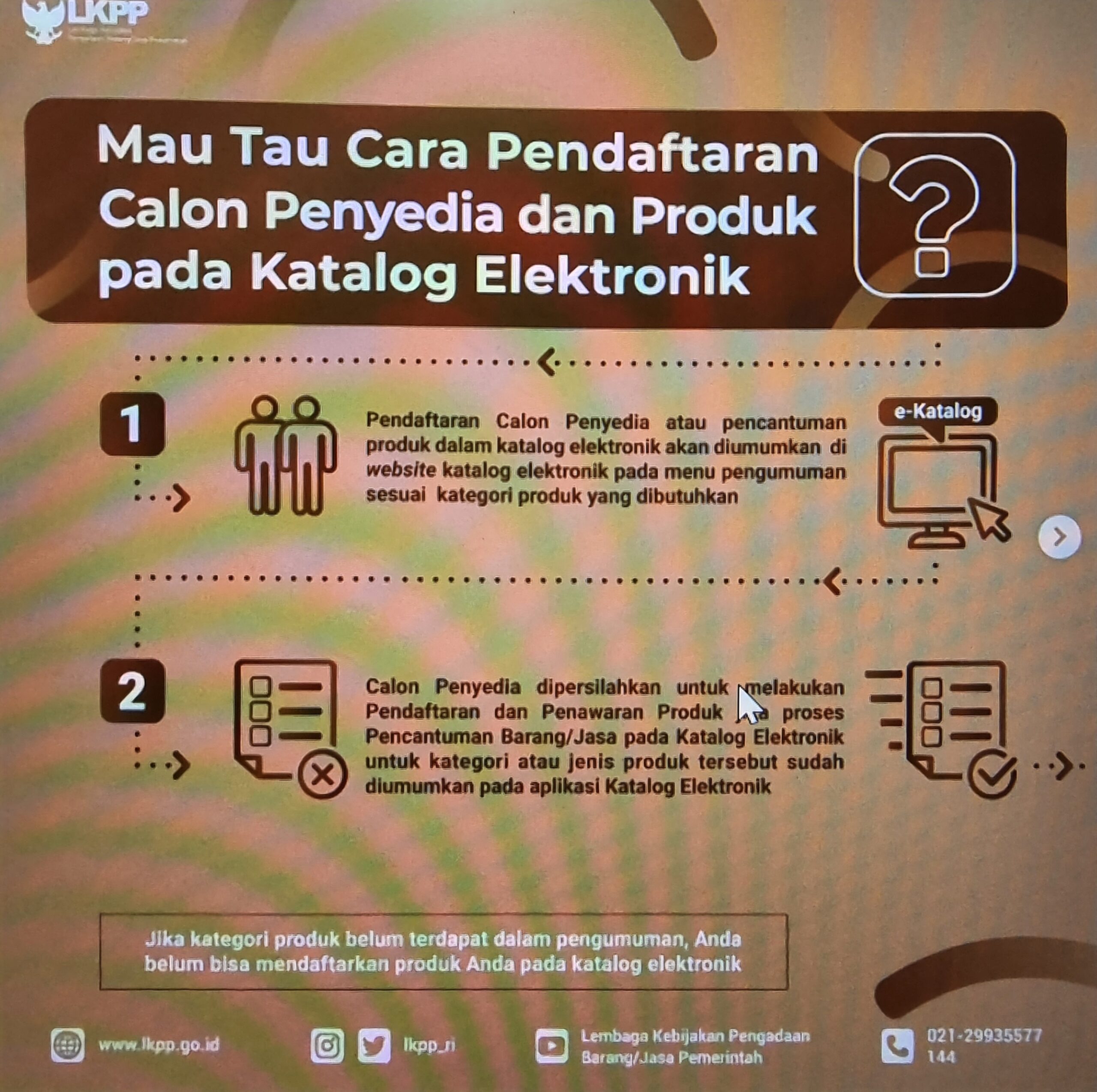 1. Pendaftaran Calon Penyedia atau pencantuman produk dalam katalog elektronik dapat dilihat di website e-katalog LKPP pada menu pengumuman sesuai dengan kategori produk dari penyedia. Jadi sering sering lah buka website katalog elektronik yaitu di https://e-katalog.lkpp.go.id/pengumuman