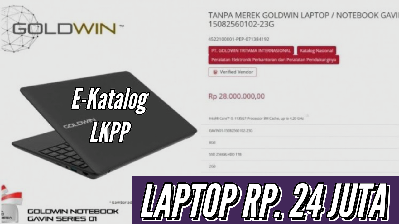 Laptop Goldwin Gavin 01 dengan harga Rp 28 juta di e-katalog LKPP menarik perhatian publik karena harganya dianggap tidak sebanding dengan spesifikasinya. Laptop ini memiliki prosesor Intel Core i5-1135G7 generasi ke-11, RAM 8 GB, penyimpanan SSD 256 GB, serta kartu grafis terintegrasi Intel Iris Xe Graphics. Spesifikasi tersebut tergolong standar dan bahkan setara dengan laptop yang di pasaran hanya dihargai sekitar Rp 7 juta hingga Rp 10 juta.